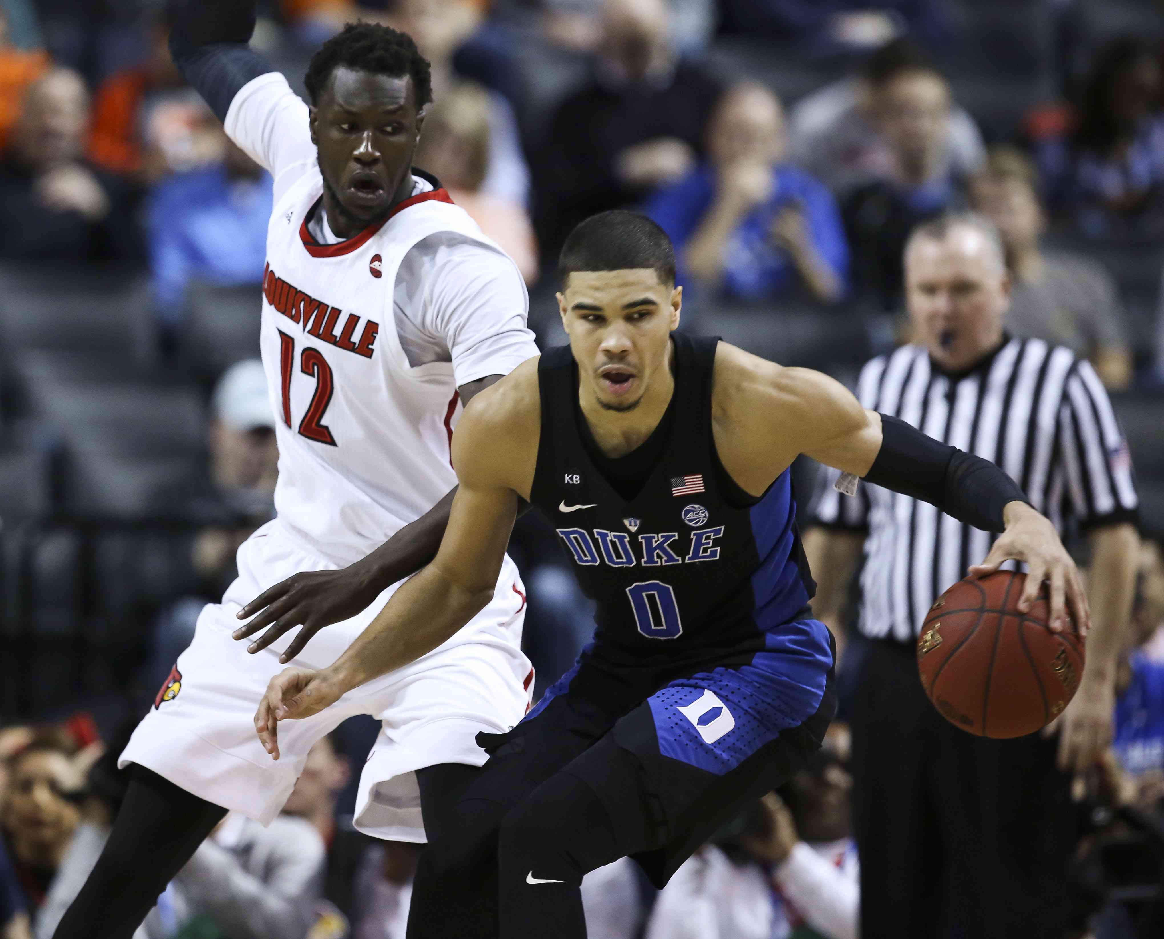 Duke forward Jayson Tatum (0) looks to move past Louisville forward Mangok Mathiang (12) during the quarterfinals of the 2017 New York Life ACC Tournament at the Barclays Center in Brooklyn, N.Y., Thursday, March 9, 2017. (Photo by David Welker, theACC.com)